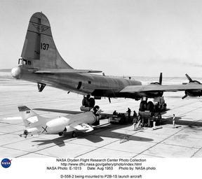 | Keywords: D-558-2 being mounted to P2B-1S launch aircraft DVIDS745835.jpg en This 1953 NACA High-Speed Flight Research Station photograph shows the Douglas D-558-2 2 Skyrocket NACA 144 prior to flight being towed under the P2B-1S launch vehicle NACA 137 for attachment The photograph also shows the large hydraulic jacks used to elevate the P2B-1S launch vehicle Once the D-558-2 was in position the P2B-1S would be lowered and the attachment made The Douglas D-558-2 Skyrockets were among the early transonic research airplanes like the X-1 X-4 X-5 and X-92A Three of the single-seat swept-wing aircraft flew from 1948 to 1956 in a joint program involving the National Advisory Committee for Aeronautics NACA with its flight research done at the NACA's Muroc Flight Test Unit in Calif redesignated in 1949 the High-Speed Flight Research Station HSFRS ; the Navy-Marine Corps; and the Douglas Aircraft Co The HSFRS became the High-Speed Flight Station in 1954 and is now known as the NASA Dryden Flight Research Center The Skyrocket made aviation history when it became the first airplane to fly twice the speed of sound The 2 in the aircraft's designation referred to the fact that the Skyrocket was the phase-two version of what had originally been conceived as a three-phase program with the phase-one aircraft having straight wings The third phase which never came to fruition would have involved constructing a mock-up of a combat-type aircraft embodying the results from the testing of the phase one and two aircraft Douglas pilot John F Martin made the first flight at Muroc Army Airfield later renamed Edwards Air Force Base in Calif on February 4 1948 The goals of the program were to investigate the characteristics of swept-wing aircraft at transonic and supersonic speeds with particular attention to pitch-up uncommanded rotation of the nose of the airplane upwards --a problem prevalent in high-speed service aircraft of that era particularly at low speeds during take-off and landing and in tight turns The three aircraft gathered a great deal of data about pitch-up and the coupling of lateral yaw and longitudinal pitch motions; wing and tail loads lift drag and buffeting characteristics of swept-wing aircraft at transonic and supersonic speeds; and the effects of the rocket exhaust plume on lateral dynamic stability throughout the speed range Plume effects were a new experience for aircraft The number three aircraft also gathered information about the effects of external stores bomb shapes drop tanks upon the aircraft's behavior in the transonic region roughly 0 7 to 1 3 times the speed of sound In correlation with data from other early transonic research aircraft such as the XF-92A this information contributed to solutions to the pitch-up problem in swept-wing aircraft The three airplanes flew a total of 313 times--123 by the number one aircraft Bureau No 37973--NACA 143 103 by the second Skyrocket Bureau No 37974--NACA 144 and 87 by airplane number three Bureau No 37975--NACA 145 Skyrocket 143 flew all but one of its missions as part of the Douglas contractor program to test the airplane's performance NACA aircraft 143 was initially powered by a Westinghouse J-34-40 turbojet engine configured only for ground take-offs but in 1954-55 the contractor modified it to an all-rocket air-launch capability featuring an LR8-RM-6 4-chamber Reaction Motors engine rated at 6 000 pounds of thrust at sea level the Navy designation for the Air Force's LR-11 used in the X-1 In this configuration NACA research pilot John McKay flew the airplane only once for familiarization on September 17 1956 The 123 flights of NACA 143 served to validate wind-tunnel predictions of the airplane's performance except for the fact that the airplane experienced less drag above Mach 0 85 than the wind tunnels had indicated NACA 144 also began its flight program with a turbojet powerplant NACA pilots Robert A Champine and John H Griffith flew 21 times in this configuration to test airspeed calibrations and to research longitudinal and lateral stability and control In the process during August of 1949 they encountered pitch-up problems which NACA engineers recognized as serious because they could produce a limiting and dangerous restriction on flight performance Hence they determined to make a complete investigation of the problem In 1950 Douglas replaced the turbojet with an LR-8 rocket engine and its pilot William B Bridgeman flew the aircraft seven times up to a speed of Mach 1 88 1 88 times the speed of sound and an altitude of 79 494 feet the latter an unofficial world's altitude record at the time achieved on August 15 1951 In the rocket configuration a Navy P2B Navy version of the B-29 launched the airplane at approximately 30 000 feet after taking off from the ground with the Skyrocket attached beneath its bomb bay During Bridgeman's supersonic flights he encountered a violent rolling motion known as lateral instability that was less pronounced on the Mach 1 88 flight on August 7 1951 than on a Mach 1 85 flight in June when he pushed over to a low angle of attack angle of the fuselage or wing to the prevailing wind direction The NACA engineers studied the behavior of the aircraft before beginning their own flight research in the airplane in September 1951 Over the next couple of years NACA pilot A Scott Crossfield flew the airplane 20 times to gather data on longitudinal and lateral stability and control wing and tail loads and lift drag and buffeting characteristics at speeds up to Mach 1 878 At that point Marine Lt Col Marion Carl flew the airplane to a new unofficial altitude record of 83 235 feet on August 21 1953 and to a maximum speed of Mach 1 728 Following Carl's completion of these flights for the Navy NACA technicians at the High-Speed Flight Research Station HSFRS near Mojave Calif outfitted the LR-8 engine's cylinders with nozzle extensions to prevent the exhaust gas from affecting the rudders at supersonic speeds This add
