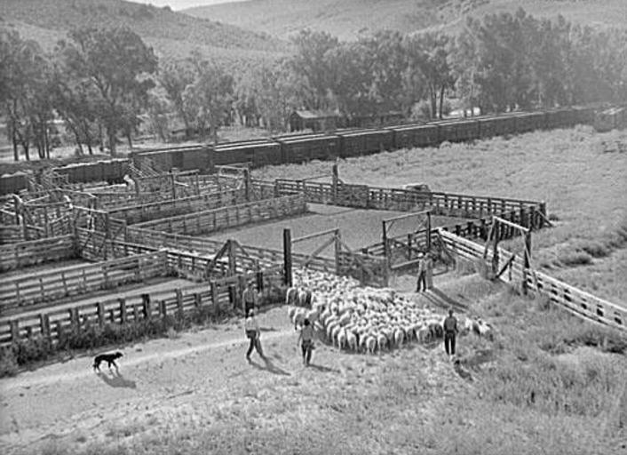 | Keywords: D&RGW fat lambs into corrals.jpg Driving herd of fat lambs into corrals along the narrow gauge railroad Cimarron Colorado http //hdl loc gov/loc pnp/fsa 8b26148 s 1940 ept Lee Russell PD-USGov PD-USGov Denver and Rio Grande Western Railroad Narrow Gauge |