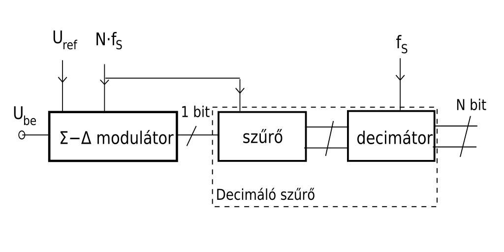 Keywords: D-szig b.svg en main functional blocks of a delta-sigma analog-to-digital converter hu Delta-szigma AD átalakító fő funkcionális egységei és kapcsolatuk Own Kmiki87 2009-06-20 Analogue-digital conversion Functional block diagrams
