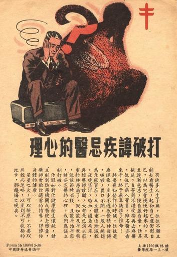Keywords: Da po hui ji ji yi de xin li Zhongguo fang lao xie hui = Breaking the psychological barrier of not seeing the doctor..JPG en A man sits on a stool feeling dizzy and uncomfortable The accompanying text urges people to see a doctor at the first sign of illness rather than engage in wishful thinking and passively hope that diseases will go away on their own When we diagnose a disease in its early stage we have a much better chance to recover so people should have an annual chest x-ray to make sure they do not have tuberculosis 2013-09-25 16 50 54 Courtesy of the National Library of Medicine Images from the History of Medicine IHM http //ihm nlm nih gov/images/E00179 Also showcased in the book Hidden Treasure New York NY Blast Books 2012 p 167 HMD Prints Photos call number PP060186 cab Shanghai Zhongguo fang lao xie hui bian yin 194u Custom license marker 2013 09 25 PD-USGov Uploaded with UploadWizard Tuberculosis Health education |