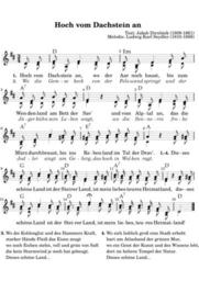 | Keywords: Dachsteinlied SteirischeLandeshymne.gif Das Dachsteinlied Steirsche Landeshymne own Manuela LilyPond source <source lang latex > \version 2 19 37 \language deutsch Absatz 0 5 smallerNoteHead -1 5 myFont Palatino Linotype set-global-staff-size 18 FootLeft string-append FootCenter string-append FootLeft string-append gesetzt mit LILYPOND lilypond-version am strftime d m Y H M S localtime current-time \paper set-paper-size a4 annotate-spacing f top-margin 25\mm ragged-right f ragged-bottom t bottom-margin 5\mm indent 0 line-width 150\mm include-special-characters print-all-headers t oddFooterMarkup \markup \fill-line \abs-fontsize 7 \FootLeft tocItemMarkup \tocItemWithDotsMarkup first-page-number 0 print-first-page-number f Abstand von Liedtext zu nachfolgender à berschrift markup-markup-spacing ' basic-distance 5 padding 5 stretchability 0 Abstand des Textes nach den Noten score-markup-spacing ' basic-distance 3 padding 3 stretchability 0 Abstand der à berschrift vom Notensystem markup-system-spacing ' basic-distance 3 padding 5 stretchability 0 \layout \context \Voice \name FirstVoice \alias Voice autoBeaming f \override NoteCollision merge-differently-dotted t \override NoteCollision merge-differently-headed t \override Stem direction UP \override Slur direction UP \override Tie direction UP \override NoteColumn horizontal-shift 0 \context \Voice \name SecondVoice \alias Voice \remove Slur_engraver \remove Tuplet_engraver autoBeaming f \override NoteCollision merge-differently-dotted t \override NoteCollision merge-differently-headed t \override NoteHead font-size smallerNoteHead \override Stem direction DOWN \override Tie direction DOWN \override NoteColumn horizontal-shift 0 \context \Staff explicitClefVisibility end-of-line-invisible explicitKeySignatureVisibility end-of-line-invisible \override StaffSymbol thickness 0 5 0 3 optimaler wert \override DynamicLineSpanner staff-padding 3 \accepts FirstVoice \accepts SecondVoice \consists Bar_number_engraver \override BarNumber break-visibility end-of-line-invisible \override BarNumber outside-staff-priority ' \override BarNumber padding 1 \override BarNumber self-alignment-X CENTER \context \StaffGroup \remove System_start_delimiter_engraver \accepts AltLyrics \context \Lyrics \name AltLyrics \alias Lyrics \override StanzaNumber font-series 'medium \override LyricText font-shape 'italic \override LyricText color x11-color 'grey20 \context \Score \remove System_start_delimiter_engraver \override RehearsalMark self-alignment-X LEFT \override RehearsalMark outside-staff-priority f \override RehearsalMark extra-offset ' -3 4 \override SpacingSpanner base-shortest-duration ly make-moment 1/16 \remove Bar_number_engraver startRepeatType endRepeatType doubleRepeatType beamExceptions ' \context \ChordNames chordNameLowercaseMinor f majorSevenSymbol \markup maj7 chordChanges f \override ChordName font-name \myFont \override ChordName font-series 'bold \germanChords alignAboveContext leadsheet \context \Voice \override NoteCollision merge-differently-dotted t \override NoteCollision merge-differently-headed t beamExceptions ' autoBeaming f smallerNoteHead -1 5 Lied Hoch vom Dachstein an Anfang myTitel Hoch vom Dachstein an Voice 1 ly parser-include-string string-append \ m myTitel 1\ \relative c' \key d \major \time 3/4 \partial 4 d8 e fis a fis'4 e8 d e h e4 g8 h a e a h g a fis4 r d8 e fis a fis'4 e8 d cis8 e cis'4 h8 a gis a h cis d gis a4 r a8 ais h g d'4 cis8 h h8 a16 fis4 a8 ais cis8 h16 a8 h g a fis4 r a8 ais h g d'4 cis8 h h8 a16 fis'4\fermata e8 d cis8 h16 cis8 h16 g8 cis d2 \bar Voice 2 ly parser-include-string string-append \ m myTitel 2\ \relative c' d8 cis d a d4 cis8 d h g h4 e8 d cis cis cis d e cis d4 s d8 cis d a d4 h8 h a8 cis a'4 gis8 fis e fis gis a h e cis4 s fis8 fis g e h'4 a8 g g8 fis16 d4 fis8 fis a8 g16 fis8 g e fis d4 s fis8 fis g d h'4 a8 g g8 fis16 d'4 cis8 h a8 g16 a8 g16 e8 a d2 Chords ly parser-include-string string-append \ c myTitel \ \chordmode s4 d2 e m a 7 d d a 7 e 7 a g d a 7 d g d a 7 d2 Song Lyrics ly parser-include-string string-append \ l myTitel \ \lyricmode \set stanza 1 Hoch vom Dach -- stein an wo der Aar noch haust bis zum Wen -- den -- land am Bett der Sav' und vom Alp -- tal an das die Mürz durch -- braust bis ins Re -- ben -- land im Tal der Drav' \set stanza 1 -4 Die -- ses schö -- ne Land ist der Stei -- rer Land ist mein lie -- bes teu -- res Hei -- mat -- land die- -ses schö -- ne Land ist der Stei -- rer Land ist mein lie -- bes teu -- res Hei -- mat -- land ly parser-include-string string-append \ l myTitel 2\ \lyricmode \set stanza 2 Wo die Gem -- se keck von der Fels -- wand springt und der Jä -- ger kühn sein Le -- ben wagt wo die Sen -- ne -- rin fro -- he Jod -- ler singt am Ge -- birg das hoch in Wol -- ken ragt \score << \new Staff leadsheet \with << << \context FirstVoice melody ly parser-include-string string-append \\\ m myTitel 1\ \context SecondVoice sndvoice ly parser-include-string string-append \\\ m myTitel 2\ >> \new Lyrics \lyricsto melody ly parser-include-string string-append \\\ l myTitel \ \new AltLyrics \lyricsto melody ly parser-include-string string-append \\\ l myTitel 2\ >> \context ChordNames ly parser-include-string string-append \\\ c myTitel \ >> \header title myTitel poet composer \markup \override ' baseline-skip 1 \right-column Text Jakob Dirnböck 1809-1861 Melodie Ludwig Karl Seydler 1810-1888 piece opus Songtext \markup \fill-line \hspace 0 1 moves the column off the left margin; can be removed if space on the page is tight \column \line \bold 3 \column Wo die Kohlenglut und des Hammers Kraft starker Hände Fleiß das Eisen zeugt wo noch Eichen stehn voll und grün von Saft die kein Sturmwind je noch hat gebeugt Dieses schöne Land \hspace 0 1 adds horizontal spacing between columns; \column \line \bold 4 \column Wo sich lieblich groß eine Stadt erhebt hart am Atlasband der grünen Mur wo ein Geist der Kunst und des Wissens lebt dort im