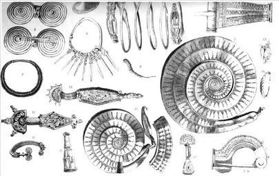 | Keywords: Dacian silver and gold objects (pre-Roman Dacia).JPG en Dacian silver and gold objects 1 Fibula Orăştie German Broos Hungarian Szászváros - Hunedoara County 2 fibula Orăştie German Broos Hungarian Szászváros Hunedoara County 3 Gold Tufalau Covasna 4 Silver bracelet Hetur Tarnava Mica Siviu 5a and 5b Golden fibula 6 Silver Somesul Cald 7 Gold torque Sarasau Maramures 8 Gold Bardotiu Transylvania 9 Golden coils Sarasau Maramures 10 Golden coils SarasauMaramures 11 Silver fibula with gold cover Seica Mica Sibiu 12 Silver fibula with gold cover Seica Mica Sibiu 13 Silver chain Somes cald 14 Golden earrings Bardotiu 15 Golden bracelet Åžimleu Silvaniei Hungarian Szilágysomlyó German Schomlenmarkt 16 Golden object Orsiova 17 Fibula with spring Seica Mica Sibiu These images had been included by Tocilescu in his thesis Dacia inainte de Romani 'Dacia before Romans published in 1877 in Annals of the Romanian Academic Society Dacia inainte de Romani 'Dacia before Romans published in 1877 in Annals of the Romanian Academic Society Bucharest Romania to Tocilescu Grigore George 26 October 1850 “ 18 September 1909 1877 PD-old Tocilescu Grigore George 26 October 1850 “ 18 September 1909 was a Romanian historian archaeologist epigrapher and folkorist member of Romanian Academy His thesis Dacia inainte de Romani 'Dacia before Romans published in 1877 in Annals of the Romanian Academic Society Ragguagli de' lavori accademici per l'anno 1826 -1830 Societa reale borbonica Annalele Societatii Academice Romane at Bucuresci Bucharest Romania PD-old-100 ImageNote 1 526 213 17 186 972 615 2 Dacian civilization is quite well represented by spiral details at almost every level of craftsmanship Though discovered evidence is scarce most are golden artifacts who conceptualize the spiral as a reference ImageNoteEnd 1 Dacian bracelets Dacia Dacians Prehistoric Romania Orăștie Grigore Tocilescu |