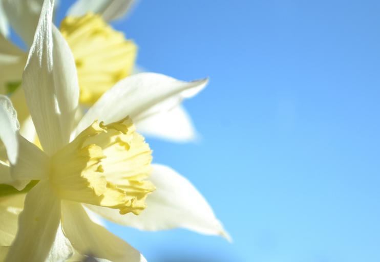 Keywords: daffodil blue yellow narcissus flora nature spring gardening flowers fresh blooms contrast natural petal sky light day