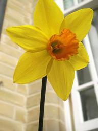 Keywords: daffodils flower yellow petals blooms blooming blossom stem buildings background windows brick wall cheerful fleurs