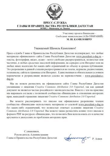 Keywords: Dagestan authorisation-Russian.png ru Письмо П есс-службы Главы и П авительства Республики Дагестан аз ешающее использование мате иалов сайта President e-dag ru под лицензией Creative Commons Attribution 3 0 Unported усский текст 2014-08-18 03 01 28 Press Service of the Head and Government of the Republic of Dagestan Рамазан Алиев PD-RU-exempt President e-dag ru Uploaded with UploadWizard Dagestan |