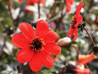 Keywords: dahlia flower blossom bloom red red dahlia side view dahlia garden bee bud ornamental plant nature summer composites ornamental flower