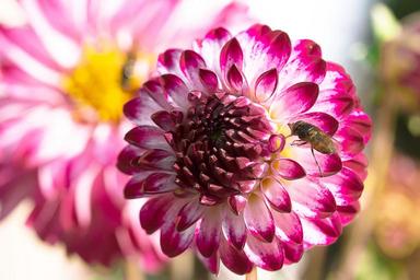 Keywords: dahlia flower composites dahlia garden blossom bloom garden plant plant bi color white-pink summer nature in the garden petals fly field beak campestris hoverfly rhingia campestris snouts-schwebfliege nectar search collect nectar insect