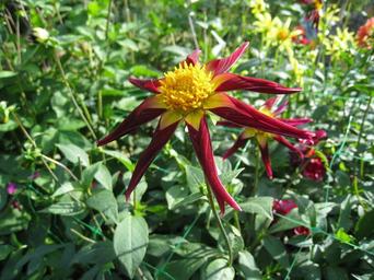Keywords: dahlia summer colors red yellow green leaf garden flowers