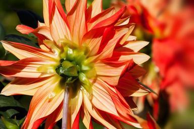Keywords: dahlias dahlia geothermal plant composites red orange flower garden ornamental flower blossom bloom flower back stick approach