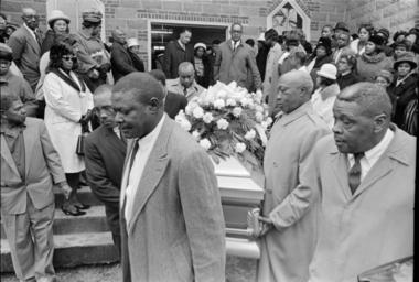 | Keywords: ms-dept-archives-history msdeptarchiveshistory moncrief mdah:sysid=94895 blackandwhite monochrome black and white Collection: Moncrief Photograph Collection Call number: PI/1994.0005 System ID: 94895. Link to the catalog Vernon Dahmer funeral, Shady Grove Baptist Church, Kelly Settlement (Hattiesburg, Miss.), afternoon of January 15, 1966. Casket carried down church steps. Scanned as TIFF in 2005-06-21 by MDAH. Credit: Courtesy of the Mississippi Department of Archives and History. Collection: Moncrief Photograph Collection Call number: PI/1994.0005 System ID: 94895. Link to the catalog Vernon Dahmer funeral, Shady Grove Baptist Church, Kelly Settlement (Hattiesburg, Miss.), afternoon of January 15, 1966. Casket carried down church steps. Scanned as TIFF in 2005-06-21 by MDAH. Credit: Courtesy of the Mississippi Department of Archives and History. |