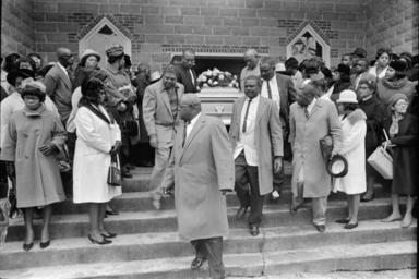| Keywords: ms-dept-archives-history msdeptarchiveshistory moncrief mdah:sysid=94894 blackandwhite monochrome outdoor black and white Collection: Moncrief Photograph Collection Call number: PI/1994.0005 System ID: 94894. Link to the catalog Vernon Dahmer funeral, Shady Grove Baptist Church, Kelly Settlement (Hattiesburg, Miss.), afternoon of January 15, 1966. Casket carried down church steps. Scanned as TIFF in 2005-06-21 by MDAH. Credit: Courtesy of the Mississippi Department of Archives and History. Collection: Moncrief Photograph Collection Call number: PI/1994.0005 System ID: 94894. Link to the catalog Vernon Dahmer funeral, Shady Grove Baptist Church, Kelly Settlement (Hattiesburg, Miss.), afternoon of January 15, 1966. Casket carried down church steps. Scanned as TIFF in 2005-06-21 by MDAH. Credit: Courtesy of the Mississippi Department of Archives and History. |