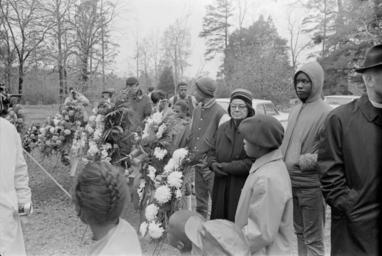 | Keywords: ms-dept-archives-history msdeptarchiveshistory moncrief mdah:sysid=94902 blackandwhite people monochrome outdoor black and white Collection: Moncrief Photograph Collection Call number: PI/1994.0005 System ID: 94902. Link to the catalog Vernon Dahmer funeral, Shady Grove Baptist Church, Kelly Settlement (Hattiesburg, Miss.), afternoon of January 15, 1966. Mourners and floral tributes at graveside during funeral. Scanned as TIFF in 2005-06-23 by MDAH. Credit: Courtesy of the Mississippi Department of Archives and History. Collection: Moncrief Photograph Collection Call number: PI/1994.0005 System ID: 94902. Link to the catalog Vernon Dahmer funeral, Shady Grove Baptist Church, Kelly Settlement (Hattiesburg, Miss.), afternoon of January 15, 1966. Mourners and floral tributes at graveside during funeral. Scanned as TIFF in 2005-06-23 by MDAH. Credit: Courtesy of the Mississippi Department of Archives and History. |