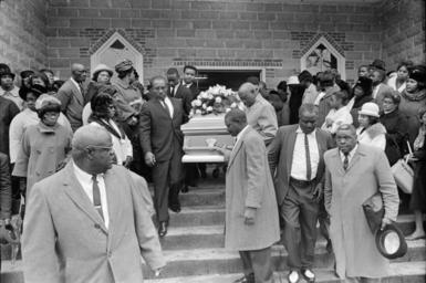 | Keywords: ms-dept-archives-history msdeptarchiveshistory moncrief mdah:sysid=94893 blackandwhite monochrome black and white Collection: Moncrief Photograph Collection Call number: PI/1994.0005 System ID: 94893. Link to the catalog Vernon Dahmer funeral, Shady Grove Baptist Church, Kelly Settlement (Hattiesburg, Miss.), afternoon of January 15, 1966. Casket carried down church steps. Scanned as TIFF in 2005-06-21 by MDAH. Credit: Courtesy of the Mississippi Department of Archives and History. Collection: Moncrief Photograph Collection Call number: PI/1994.0005 System ID: 94893. Link to the catalog Vernon Dahmer funeral, Shady Grove Baptist Church, Kelly Settlement (Hattiesburg, Miss.), afternoon of January 15, 1966. Casket carried down church steps. Scanned as TIFF in 2005-06-21 by MDAH. Credit: Courtesy of the Mississippi Department of Archives and History. |