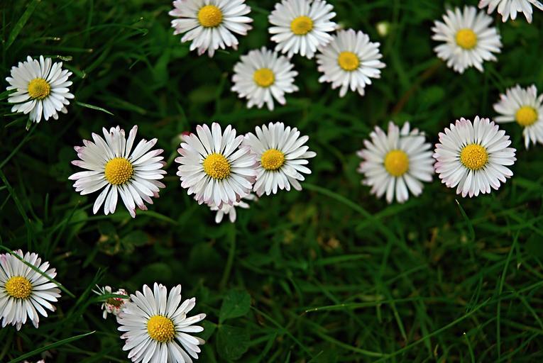 Keywords: daisies daisy flower blade green lawn grass white yellow flowers