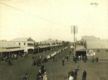 Keywords: Dalby main street ca. 1915.jpg Children marching in the main street of Dalby ca 1915<br/> Possibly at the time of a visiting recruiting team for recruitment for troops to go overseas during WWI handle 10462/deriv/122968 ca 1915 Author 27 11 0 92 S 151 15 47 86 E region AU_heading S PD-Australia StateLibQld-License History of Dalby Queensland