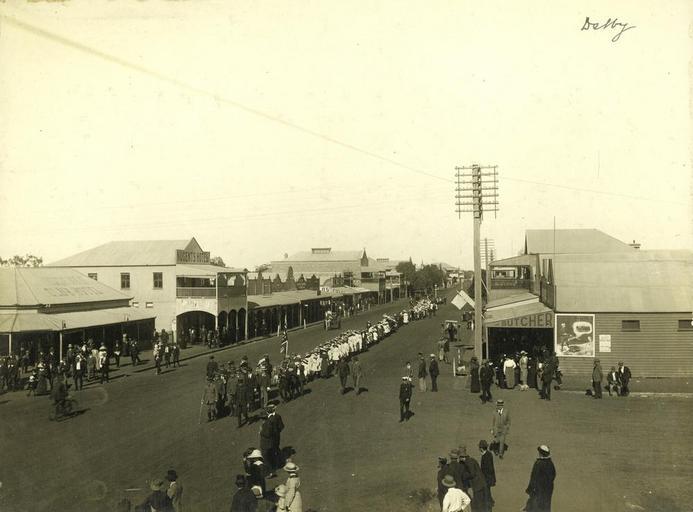 | Keywords: Dalby main street ca. 1915.jpg Children marching in the main street of Dalby ca 1915<br/> Possibly at the time of a visiting recruiting team for recruitment for troops to go overseas during WWI handle 10462/deriv/122968 ca 1915 Author 27 11 0 92 S 151 15 47 86 E region AU_heading S PD-Australia StateLibQld-License History of Dalby Queensland |