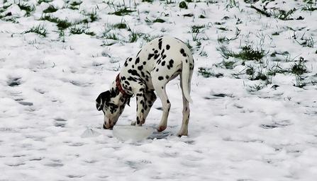 Keywords: dalmatian spots snow winter pet dog animal canine domestic mammal young adorable outdoors doggy fur