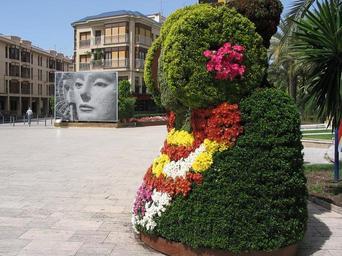 | Keywords: Dama de Elche (flores y vitromosaico).jpg 2006 in Spain Una de las múltiples réplicas de la Dama de Elche repartida por la ciudad ésta compuesta por flores Al fondo un vitromosaico del rostro de la Dama Fotografía propia 2006-06-07 José Manuel Pérez Dominio público Replicas of Dama d'Elx |