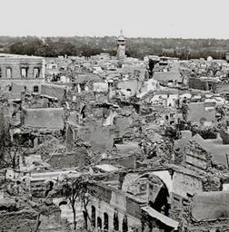 | Keywords: DamasChristianQuarter1860.jpg Glass-photo ca 1860 of the destruction of the Christian Quarter in Damascus in 1860 The violent incident started on the 9th of July when a mob of 20 000-50 000 from the Maidan and Salihya districts of Damascus attacked killed and pillaged the Christian Quarter and its inhabitants 5 000 to 12 000 were estimated to have perished The Greek Orthodox the Greek Catholic and the Armenian churches were the first to be burned The Russian consulate was the first to be attacked followed by the French then the Dutch Austrian Belgian and the American consulates Abdu Costi the American Consul was beaten and left for dead The Prussian and the English Consulates were saved AN OCCASION FOR WAR Leila Tarazi Fawaz University of California Press 1994 Abdul Qadir al-Jazairi the exiled Algerian hero along with his 1000 volunteers protected most of the Diplomats and thousands of Christians in his houses He was awarded the highest medals by the European governments The building on the left is the French Lazarists Monastery and school burned by the attackers http //mideastimage com/result aspx 1860 PD-Syria 1860 in Damascus 1860 Lebanon conflict |
