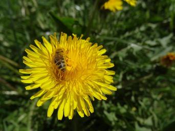 Keywords: dandelion bee honey bee insect flower blossom bloom close yellow pointed flower pollen pollination meadow taraxacum spring plant macro nature composites common dandelion real bees animal