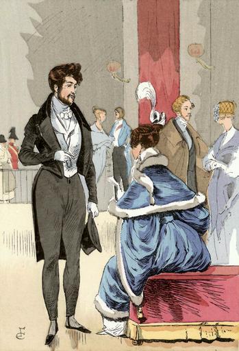 Keywords: Dandyism in the Romantic period - a ballroom in 1834.jpg Artwork The gentleman is wearing tight fitting pants that are lighter than his coat His pants have boot straps as well reminiscent of an English riding costume He wears a short-waisted coat with basques or tails à l'anglaise or longer tails In his hand he carries a haut-de-forme or top-hat He is dressed rather somberly reminiscent of the spirit of the 'spleen' during the Romantic Period The woman seated in front of the man wears a fur-trimmed blue dress and a white feather in her hair Abstract source Boucher François 20 000 Years of Fashion New York Harry N Abrams Inc 1967 1898 1 colored plate 10 x 15 cm Institution Brown University Library object history exhibition history credit line accession number 1150467184856208 PD-old-100 19th-century people of Paris Ballrooms in Paris Females with blue dresses in art Fur garments in art Images of Paris from the Brown University Library Les modes de Paris 044 Fashion plates depicting men People of France in 1834 Dandies 1830s dresses Fur fashion in 1834 |