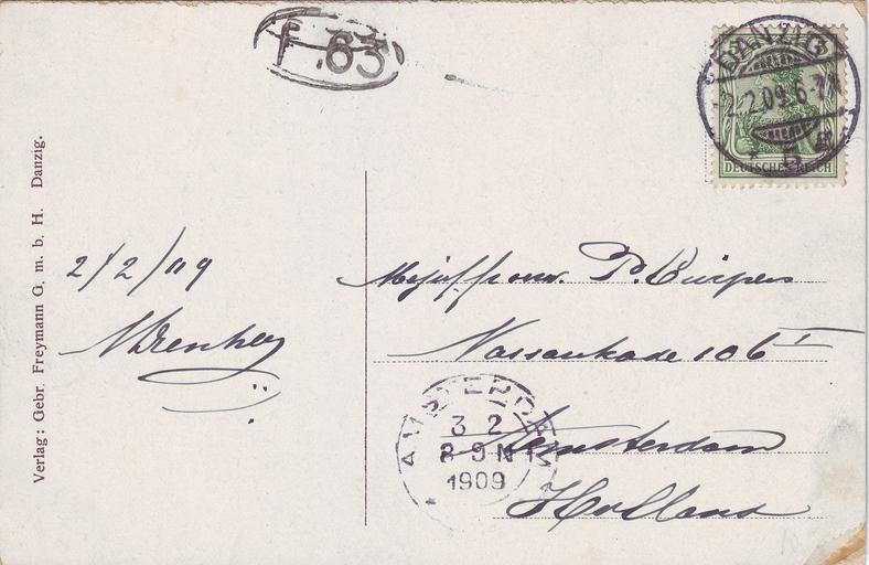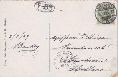 | Keywords: Danzig-1909-voor.jpg en Danzig Postcard sent on 2 February 1909 from Danzig 5 the post office at the station to Amsterdam with Germania stamp 1909-02-02 postcard franking ; 2014-04-25 scan own scan Stamp designer Creator Paul Eduard Waldraff Sijtze Reurich cc-by-sa-3 0 Stamp 1917 Postcard PD-text Uploaded with UploadWizard Postcards of Germany 1902 stamps of the German Empire Stamps on covers and postcards History of GdaĆsk | ||||