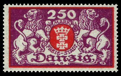 | Keywords: Danzig 1923 119 großes Staatswappen.jpg / Briefmarkenbeschreibung Dauermarkenserie Definitive stamp series Ausgabepreis 250 Mark First Day of Issue / Erstausgabetag 24 Januar 1923 Michel-Katalog-Nr 119 Danzig scanned by NobbiP 2011-09-30 Buchholz PD-old-auto-1996 1944 PL Max Buchholz German stamps review keep <gallery> File Danzig 1923 120 großes Staatswappen jpg 1923 120 File Danzig 1923 121 großes Staatswappen jpg 1923 121 File Danzig 1923 122 großes Staatswappen jpg 1923 122 </gallery> Philately großes Staatswappen mit 2 flankierenden Löwen Nennwert 250 Mark 1923-01-24 Buchholz 473 000 Buchdruck 119 Danzig Coats of arms of Gdańsk on stamps 1923 stamps of the Free City of Danzig |