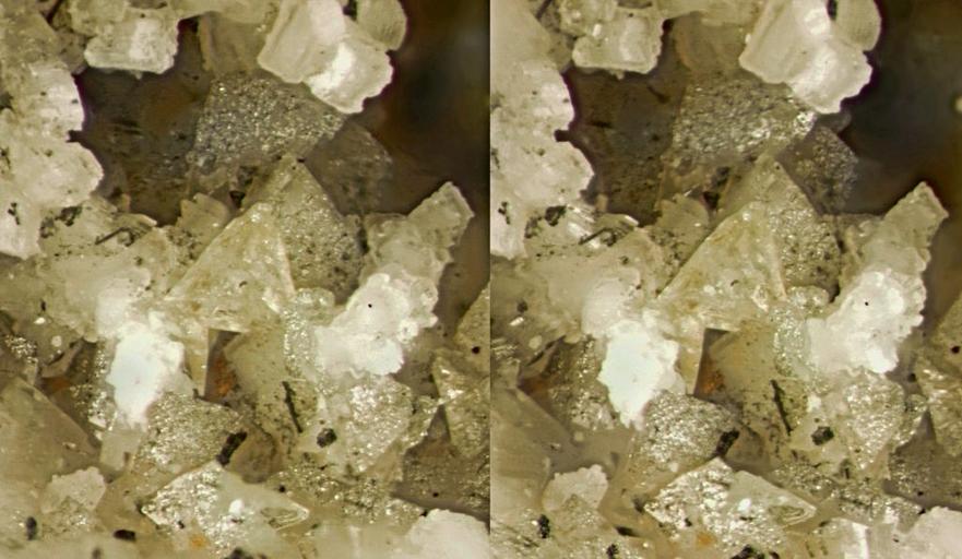 Keywords: Daqingshanite-(Ce)-283082.jpg en Locality Poudrette quarry Demix quarry; Uni-Mix quarry; Desourdy quarry; Carrière Mont Saint-Hilaire Mont Saint-Hilaire La Vallée-du-Richelieu RCM Montérégie Québec Canada FOV 1 3 x 1 5 mm Via Monteregian Minerals LH Stereo pair MOB coll The pale yellowish triangular xl in the center is daqingshanite It is actually a trigonal pyramid that looks like a shallow tetrahedron The xl is less than 0 4 mm on edge Daqingshanite is a very rare mineral According to Horvath Min Rec 1990 it was probably found only once at MSH I used stereo because the xls are very pale and on a very pale background Stereo overcomes the lack of contrast to some extent There are two other daqingshanite xls in the photo but they are even smaller and very hard to spot due to their size and orientation Again - stereo helps 2012-10-21 11 51 52 http //www mindat org/photo-283082 html Modris Baum other versions cc-zero Daqingshanite- Ce |