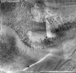 | Keywords: Dark Spots and Fans DVIDS727562.jpg en As winter turns to spring at the south polar ice cap of Mars the rising sun reveals dark spots and fans emerging from the cold polar night Using visual images left and temperature data right from the Thermal Emission Imaging system on NASA's Mars Odyssey orbiter scientists have built a new model for the origin of the dark markings Scientists propose the markings come from dark sand and dust strewn by high-speed jets of carbon-dioxide gas These erupt from under a layer of carbon-dioxide ice that forms each Martian winter Credit NASA/JPL/Arizona State University NASA Identifier SPD-MARS-odysseygallerymartianterrainDarkSpots-Fans_img4 2009-09-22 Glenn Research Center https //www dvidshub net/image/727562 727562 2012-10-17 14 05 WASHINGTON DC US PD-USGov Arizona State University Images from DoD uploaded by Fæ |