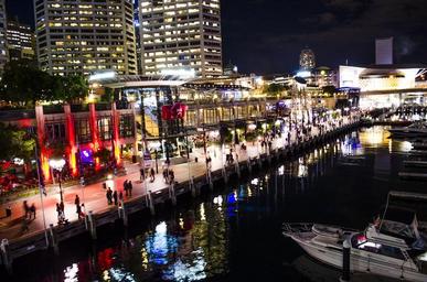 Keywords: darling harbour sydney night lights reflection lights australia shops water boat