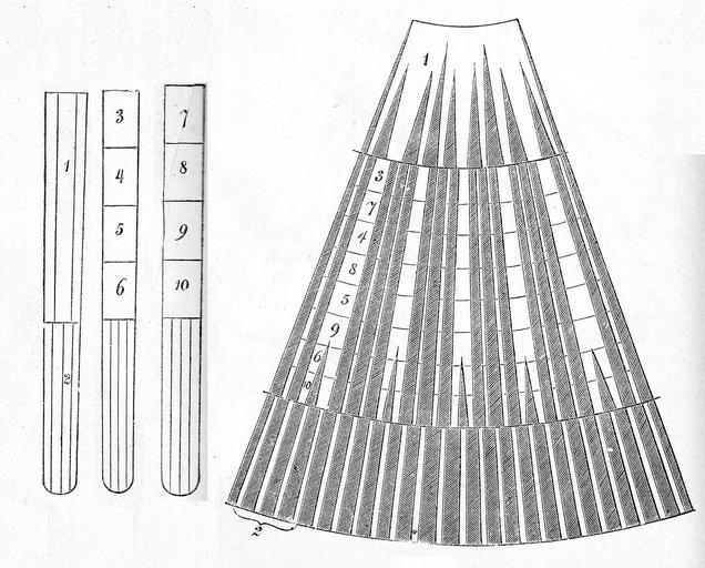 | Keywords: Das Ganze der Kürschnerei, Paul Cubäus, Alexander Tuma, 1. Auflage ( Fig. 25, S. 296), Das Galonieren.jpg Technical book for Furriers Paul Cubaeus Das Ganze der Kürschnerei Gründliches Lehrbuch alles Wissenswerthen über Waarenkunde Zurichterei Färberei und Verarbeitung der Pelzfelle Erste Auflage Wien Pest Leipzig 1891 Seite 296 Fig 25 Fig 22 stellt einen Zobelschweif dar Man schneidet unten circa 1½ bis 2 <sup>c</sup>/m die Spitze dann oben an der Wurzel rechts und links die wilden Haare ab Die Spitzen kann man unten an Boas Besätzen Krägen 18px wo die Schweifspitze den Schluß bildet verwenden; bei Muffen muß sie abgeschnitten werden weil der Schweif sonst zu sehr absticht Hierauf theilt man den Schweif in der Breite in vier Theile die zwei mittelsten bleiben soweit der Schweif egal breit ist beisammen nur unten wo er schmäler wird setzt man ein schräges Stückchen Galon Fig 22 ein Die zwei Streifen an den Seiten werden eingeschnitten und mit 6 <sup>m</sup>/m breitem Galon versehen an einer Seite kommt 1 <sup>c</sup>/m breit Galon Auf diese Weise bereitet man vor zu Boas und Muffen Bei Boas nimmt man gewöhnlich zwei Schweife nebeneinander und muß auch beim Sortieren dafür sorgen daß oben etwas heller raucher unten etwas dunklere flachere genommen werden damit die Boa nach unten etwas spitzer verläuft Bei Muffen nimmt man je nach der Größe des Muffs vier Höhen übereinander und 5-7 Schweife nebeneinander Die größte Sorgfalt ist darauf zu achten daß die einzelnen Schweife sowie die Galons genau aufeinander passend gesetzt werden Verschönern kann man die Arbeit wenn man zwei Schweife in der Länge mit einander versetzt so daß sie einen doppellangen bilden Man vermeidet auf diese Weise die Abstufung in der Farbe Wie in Figur 23 theilt man jeden Schweif in der Länge in sechs Theile und setzt dieselben übereinander wie angegeben Diese Eintheilung wird vorher durch Bleistiftstriche markirt dann zuerst die Galons eingeschnitten dann erst die Querschnitte gemacht versetzt zusammengenäht und die Galons eingesetzt Schwieriger wird die Arbeit des Versetzens der Schweife wenn man Pelerinen oder Besätze welche nach unten breiter auslaufen aus Schweifen zu fertigen hat In welcher Weise diese Arbeit auszuführen ist hängt von der Länge der Pelerine sowie der Schweife ab Aus Fig 24 ist ersichtlich daß man am besten oben einen Aufsatz von halben Schweifen macht die man auch nur nach unten zu galoniert um sie keilförmig zu machen und die untere Hälfte bei welcher man dann auch die äußerste Schweifspitze nicht abschneidet zum Einsetzen zu benutzen damit die Pelerine nach unten die verlangte Weite bekommt Figur zeigt einen Abschnitt der Pelerine die nur so hoch ist daß 1½ Schweifhöhe genügen Fig 25 ist auf drei Schweifhöhen berechnet und nach unten weiter die unteren Schweife sind versetzt bis zur Hälfte dann abgeschnitten und aus der unteren Hälfte der Schweife welche der dunkleren Färbung wegen egaler aussieht mit Einsetzen der drei halben Schweife des Aufsatzes eine dritte Höhe gemacht Man sieht ferner auf der Zeichnung daß an diesem Aufsatz um die keilförmige Form herauszubringen die Schweife nach oben gar nicht mehr galonirt sind sondern an der äußersten Kante fest zusammengenäht was auch deswegen nöthig ist um oben eine saubere Kante zu haben Bei Besätzen von ein oder zwei Schweifen Höhen die mehr gerade gearbeitet sind muß man aber um den Galon nicht an der oberen Kante zu haben und ein sauberes Aussehen zu bewirken Schweife in der Länge theilen entweder in 2 3 oder 4 Theile davon 1 Käntchen arbeiten und quer oben darüber ansetzen Da nun das Haar nach oben schlägt so braucht man beim Aufsetzen des Besatzes denselben nicht zu verziehen sondern nur zu vernähen Collection Kuhn 1891 Paul Cubaeus PD-old <gallery> Das Ganze der Kürschnerei Paul Cubaeus Alexander Tuma 1 Auflage Fig 22 S 293 Das Galonieren jpg Fig 22 Das Ganze der Kürschnerei Paul Cubäus Alexander Tuma 1 Auflage Fig 23 S 294 Das Galonieren jpg Fig 23 Das Ganze der Kürschnerei Paul Cubäus Alexander Tuma 1 Auflage Fig 24 S 295 Das Galonieren jpg Fig 24 Das Ganze der Kürschnerei Paul Cubäus Alexander Tuma 1 Auflage Fig 25 S 296 Das Galonieren jpg Fig 25 </gallery> Das Ganze der Kürschnerei von Paul Cubaeus 1891 Erste Auflage Sable fur-skin manufacturing Fur-tail manufacturing Taping fur |