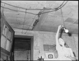 | Keywords: Daughter of Gillie Treadway, a miner, turning on the elecrtic light in their house - NARA - 541160.tif Scope and content Daughter of Gillie Treadway a miner turning on the elecrtic light in their house There is no protection from fire in this camp; the nearest fire fighting equipment is in Pineville about seven miles away; water for fire fighting must be pumped from the meager stream; the only telephone in the camp is in the store which is locked and no key is kept in the camp during the night Houses usually burn to the ground within twenty minutes after the fire gets going Notice the wiring Fox Ridge Mining Company Inc Hanby Mine Arjay Bell County Kentucky General notes 541160 Local identifier 245-MS-2176L Department of the Interior Solid Fuels Administration For War 04/19/1943 - 06/30/1947 NARA-Author Lee Russell 1903-1986 Photographer 2489414 <br /> Still Picture Records Section Special Media Archives Services Division NWCS-S National Archives at College Park 8601 Adelphi Road College Park MD 20740-6001 1946-08-31 Record group Record Group 245 Records of the Solid Fuels Administration for War 1937 - 1948 Record group ARC 572 Photographs of the Medical Survey of the Bituminous Coal Industry compiled 1946 - 1947 Series ARC 540230 File unit File unit ARC Variant control numbers NAIL Control Number NWDNS-245-MS-2176L yes Other versions <gallery> File Daughter_of_Gillie_Treadway _a_miner _turning_on_the_elecrtic_light_in_their_house_-_NARA_-_541160 tif tif File Daughter_of_Gillie_Treadway _a_miner _turning_on_the_elecrtic_light_in_their_house_-_NARA_-_541160 jpg jpg </gallery> NARA-cooperation PD-USGov Coal mining in the United States NARA TIF images with categorized JPGs |