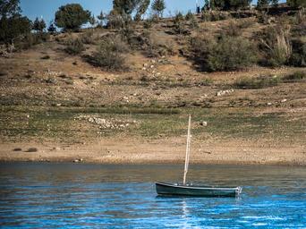 Keywords: dawn marsh viñuela axarquia malaga andalusia spain blue water backlight mountain calm stillness light sky clouds rays highlights stelae stones rocks sailboat boat float
