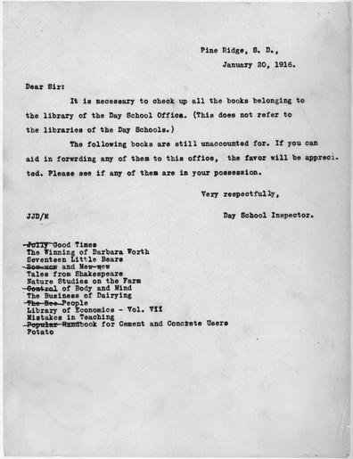 | Keywords: Day School Inspector to Unknown Person. - NARA - 284898.tif Scope and content Concerning books belonging to the library of the Day School Office General notes 284898 Local identifier Department of the Interior Office of Indian Affairs Pine Ridge Agency 1878 - 09/17/1947 NARA's Central Plains Region Kansas City NREA 400 West Pershing Road Kansas City MO 64108 1916-01-20 Record group Record Group 75 Records of the Bureau of Indian Affairs 1793 - 1999 Record group ARC 404 Correspondence of the Day School Inspector J J Duncan compiled 02/09/1910 - 09/06/1916 Series ARC 283922 File unit Correspondence of Day School Inspector J J Duncan Jan 19 1916-Sept 6 1916 01/19/1916 - 09/06/1916 File unit ARC 284892 Variant control numbers NAIL Control Number NRE-75-169-K-6 yes Other versions NARA-cooperation PD-USGov Documents related to Pine Ridge Indian Reservation |
