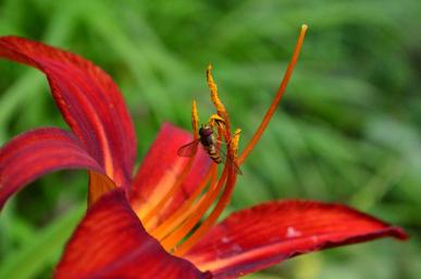 Keywords: daylily lily flower incomplete red orange bloom ovary stamp stamens hoverfly insect