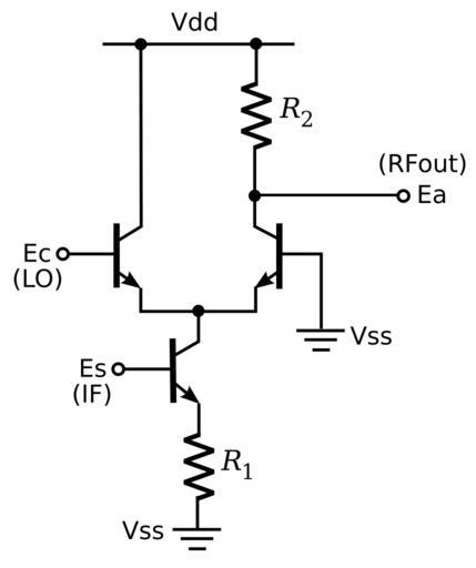 Keywords: DBM SingleEnd IC.svg en Double Balanced Mixer Single End implemented in Integrated Circuit Drawn by myself KStar 2009-11-11 PD Single balanced mixer circuits