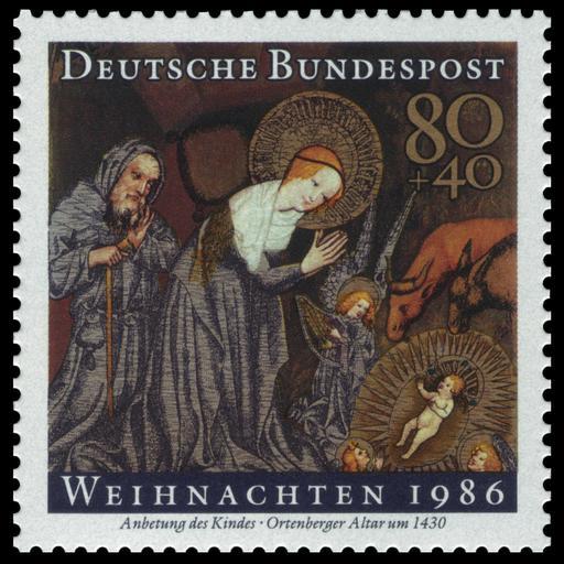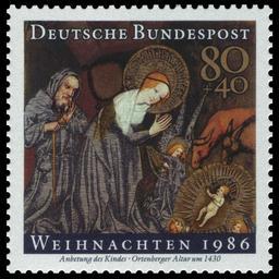 | Keywords: DBP 1986 1303 Weihnachten.jpg Christmap stamp with additional social fee 1986 Weihnachtsmarke mit Zuschlag 1986 Graphics by Lüdtke Ausgabepreis 80+40 Pfennig First Day of Issue / Erstausgabetag 13 November 1986 Michel-Katalog-Nr 1303 scanned by NobbiP 2010-09-03 Deutsche Bundespost PD-old-100-1923 Philately Linker Flügel des Ortenberger Altars um 1420 Anbetung des Kindes Nennwert 80+40 Pfennig 1986-11-13 Lüdtke 10 989 000 Offsetdruck 1303 1986 Deutsche Bundespost stamps 1303 Weihnachtsmarke Germany Ortenberg Hessen Christmas in Germany in the 1980s Christmas 1986 in Europe 1986-11-13 November 1986 in West Germany German stamps review keep |