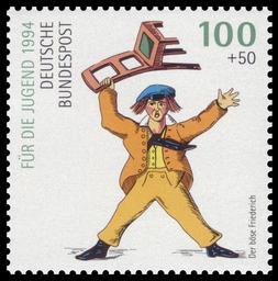 | Keywords: DBP 1994 1729 Der böse Friederich.jpg For the youth 100th day of death of Heinrich Hoffmann Writer Für die Jugend 100 Todestag von Heinrich Hoffmann Autor Graphics by Ehmke Ausgabepreis 100+50 Pfennig First Day of Issue / Erstausgabetag 14 April 1994 Michel-Katalog-Nr 1729 scanned by NobbiP 2011-01-16 creator Heinrich Hoffmann writer PD-old-100 <gallery> File DBP 1994 1726 Paulinchen jpg Paulinchen File DBP 1994 1727 Hanns Guck-in-die-Luft jpg Hanns Guck-in-die-Luft File DBP 1994 1728 Struwwelpeter jpg Struwwelpeter File DBP 1994 1730 Zappel-Philipp jpg Zappel-Philipp </gallery> Philately Der böse Friederich Nennwert 100+50 Pfennig 1994-04-14 Ehmke 3 076 000 Offsetdruck 1729 1994 stamps of Germany 1729 Children's literature on stamps Jugendmarken Reception of Struwwelpeter German stamps review keep |