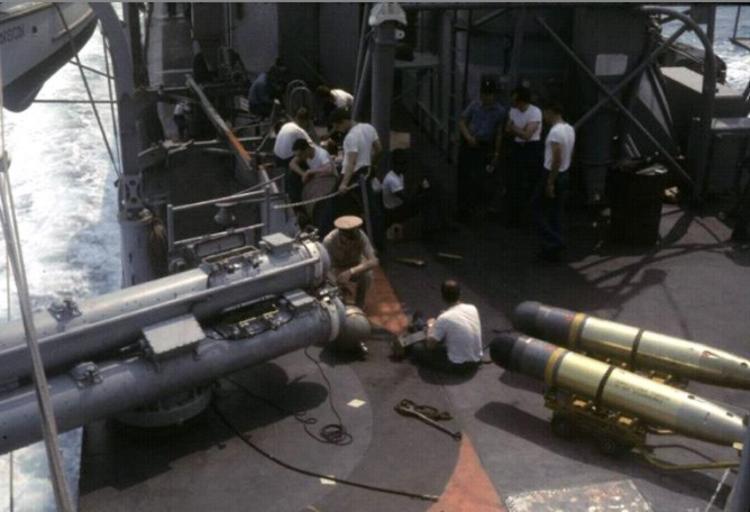 Keywords: DD-729 Mk 32 torpedo tubes 1969.jpg Maintenance on Mk 32 torpedo tubes of the U S Navy's Allen M Sumner-class destroyer USS Lyman K Swenson DD-729 during the Vietnam War between November 1968 and July 1969 Two Mk 37 torpedoes are visible on the right U S Navy sailor or employee http //www dd729 com/WESTPAC/Presentation_Files/index html 1968/69 author PD-USGov-Military-Navy USS Lyman K Swenson DD-729 Mark 37 torpedo Mark 32 Surface Vessel Torpedo Tubes |