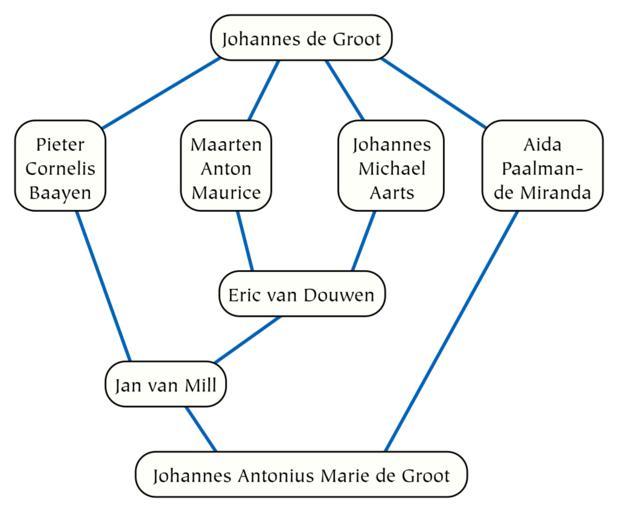 | Keywords: De Groot academic genealogy.svg The complicated academic genealogy of Johannes De Groot and his namesake http //www genealogy ams org/id php id 48500 Johannes Antonius Marie de Groot Own 2008-04-05 David Eppstein Mathematicians from the Netherlands Files by User David Eppstein from en wikipedia |