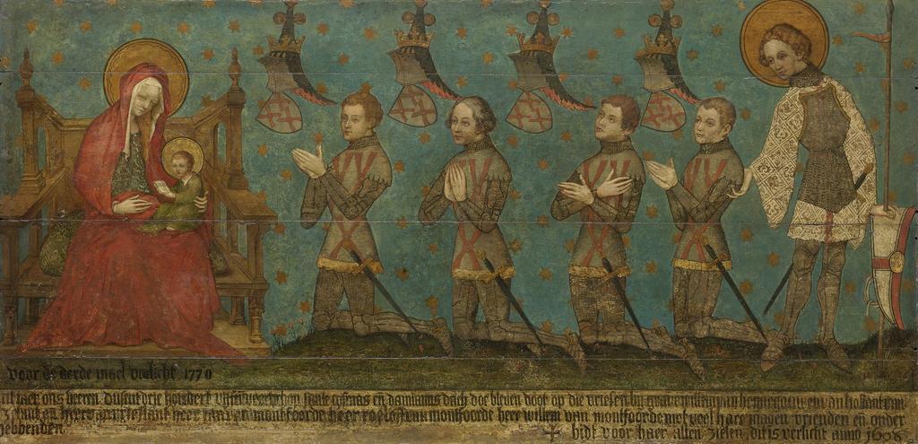 Keywords: De heren van Montfoort Rijksmuseum SK-A-831.jpeg accession number SK-A-831 nl Gedachtenistafel van de Heren van Montfoort Links zit Maria met het Christuskind op een troon Rechts knielen in aanbidding vier heren van Montfoort gekleed in gelijkvormige wapenrustingen Boven iedere figuur een wapenschild gedekt door een helm met kroon en vlucht Rechts staat de heilige Joris Voorgesteld zijn van links naar rechts Jan I van Montfoort zijn oudoom Roelof de Rover zijn oom Willem de Rover en een man die vermoedelijk Hendrik de Rover Willemsz voorstelt De eerste drie mannen sneuvelden in het gevolg van graaf Willem van Henegouwen tijdens zijn veldtocht tegen de Friezen in 1345 Geschilderd voor het altaar van de heilige Maagd in de Sint Janskerk te Linschoten ; Noordelijke Nederlanden ca 1400 olieverf op paneel drager Height cm 69 5 drager Width cm 142 9 lijst Height cm 86 lijst Width cm 157 5 lijst Dikte cm 6 exhibition history 2011-2012 Langdurig Bruikleen Centraal Museum-II Utrecht 2004-2009 Bruikleen tijdens renovatie RM Centraal Museum Utrecht Utrecht 1958-1958 Middeleeuwse Kunst der Noordelijke Nederlanden Amsterdam Institution Rijksmuseum Technique oil panel object history Acquisition 1884-08-09 object type Potential derivatives exist check http //commons wikimedia org/w/index php search Rijksmuseum+SK-A-831 this search PD-US PD-old-100 Data and photography rights All data and all images made available through the API are either in the public domain or are subject to a CC0 license https //www rijksmuseum nl/en/api/terms-and-conditions-of-use cc-zero place of creation Noordelijke Nederlanden Bart Ibelings 'De opdrachtgever en oudst bekende restauratie van de memorietafel van de heren van Montfoort' Heemtijdinghen 48 2012 nr 2 p 65-74 Liesbeth M Helmus Schilderen in opdracht Noord-Nederlandse contracten voor altaarstukken 1485-1570 Utrecht 2009 p 44M J Bok 'Laying claims to nobility' Simiolus 2/3 1996 p 222-223 + afb Bart Ibelings De opdrachtgevers en oudst bekende restauratie van de memorietafel van de heren van Montfoort Heemtijdinghen 48/2 2012 Jaarboek Amstelodamum 88 1996 p 31 + afb W van Anrooij 'De Memorietafel van de heren van Montfoort en het Hollandse gravenhof omstreeks 1400' in Madoc tijdschrift over de Middeleeuwen 3 1989 nr 2 p 22-28H W van Os 'De gebreken van de beeldtaal' O K 23 1979 nr 5 p 134 afb 6R Terner 'Bemerkungen zur Madonna des Kanonikus van der Paele' Zeitschrift für Kunstgeschichte 42 1979 p 85 afb 4 N Plomp Een Linschotens schilderstuk uit de veertiende eeuw Heemtijdinghen 13 1977 p 44-49 K Bauch 'Bildnisse des Jan van Eyck' Studien zur Kunstgeschichte 1967 p 105 Marius Pieter van der Linden De burggraven van Montfoort in de geschiedenis van het Sticht Utrecht en het graafschap Holland ± 1260-1490 Assen 1957 K G Boon Maandblad voor Beeldende Kunst 1950 p 263 A Hulshof Utrechtse panelen Utrecht 1944 afb 29 vgl miniatuur van Willem van Montfoort en getijdenboekJ Blok 'Gegevens van de geschiedenis der kleederdrachten kleeding in de 14de eeuw uit de rekeningen der grafelijkheid' Bulletin van den Nederlandsch Oudheidkundige Bond 1914 p 185 189 over de harnassenNavorscher XXII p 269 Gerson Geertgen p 8 afb 4 Documentatiemap Schilderijen aantekeningen R van Luttervelt voor 1963 Correspondentie Gemeentearchief Amsterdam C Noordam over Hendrik Rover van Heulestein 9 april 1996; correspondentie H M Zijlstra-Zweens over de afgebeelde helmen 14 juli 1986; overdruk tentoonstellingscatalogus 'Die Parler' 1978 Documentatiemap Schilderijen papiertje met naam van schenker 1884; correspondentie over identificatie Heren van Montfoort 1996 http //www rijksmuseum nl/collectie/SK-A-831 De heren van Montfoort Uploaded with GWToolset De heren van Montfoort Rijksmuseum SK-A-831 http //www rijksmuseum nl/media/assets/SK-A-831 Images uploaded by Fæ Images from the Rijksmuseum Early Netherlandish paintings in the Rijksmuseum Amsterdam |