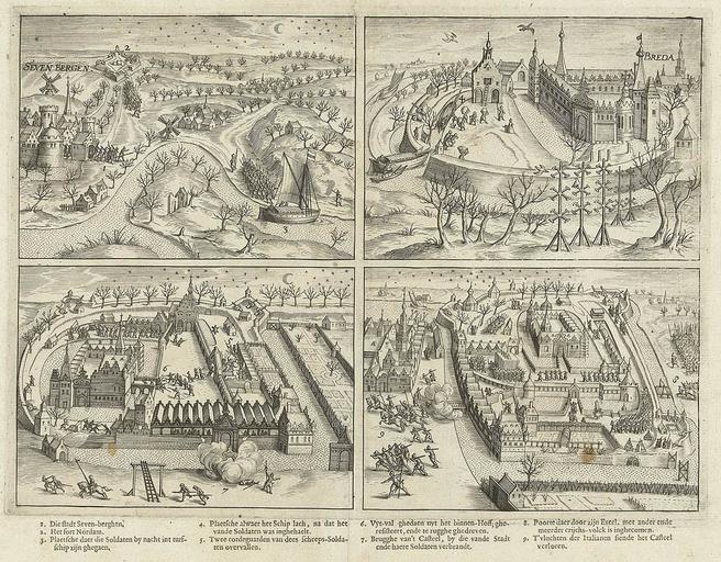 | Keywords: De inname van Breda door Prins Maurits op 4 maart 1590 in vier scènes - The capture of Breda by Prince Maurice in 1590 in 4 scenes.jpg Attributed to prins Maurits 4 maart 1590 in vier scènes 1600-1601 Engraving LangSwitch typeset boekdruk cm 32 41 Institution Rijksmuseum Amsterdam Rijksprentenkabinet RP-P-OB-80 091 Attributed to Bartholomeus Willemsz Dolendo Bartholomeus Willemsz Dolendo Inname van Breda 1590 1600-1601 en/of 1610 SEVEN BERGEN depicted place top left ~ BREDA depicted place top right ~ inscription nl bottom caption <table style width 100 ; font-size 0 8em > <td>1 Die stadt Seven-berghen <br /> 2 Het fort Nordam <br /> 3 Plaetsche daer die Soldaten by nacht int turf- <br /> schip zijn ghegaen </td> <td> 4 Plaetsche alwaer het Schip lach na dat het <br /> vande Soldaten was inghehaelt <br /> 5 Twee cordeguarden van dees scheeps-Solda- <br /> ten overvallen </td> <td>6 Vyt-val ghedaen uyt het binnen-Hoff; ghe- <br /> resisteert ende te rugghe ghedreven <br /> 7 Brugghe van ™t Casteel by die vande Stadt <br /> ende haere Soldaten verbrandt </td> <td>8 Poorte daer door zijn Excel met ander ende <br /> meerder crijchs-volck is inghenomen <br /> 9 T ™vluchten der Italianen siende het Casteel <br /> verloren </td> </table> object history ProvenanceEvent 1881 purchase LangSwitch das the le het Rijksmuseum Amsterdam Amsterdam RP-P-OB-80 091 www rijksmuseum nl http //www rijksmuseum nl/ lang en Home https //www rijksmuseum nl/collectie/RP-P-OB-80 091 Info https //www rijksmuseum nl/assetimage2 jsp id RP-P-OB-80 091 Pic De inname van Breda door Prins Maurits op 4 maart 1590 in vier scènes - The capture of Breda by Prince Maurice in 1590 in 4 scenes-large jpg Second version at the Rijksmuseum Amsterdam RP-P-OB-80 092 PD-old-100 History of Breda Conflicts in 1590 Turfschip van Breda Bartholomeus Willemsz Dolendo Attributed Dutch 17th-century prints in the Rijksmuseum Amsterdam Dolendo Attributed to Bartholomeus Willemsz |