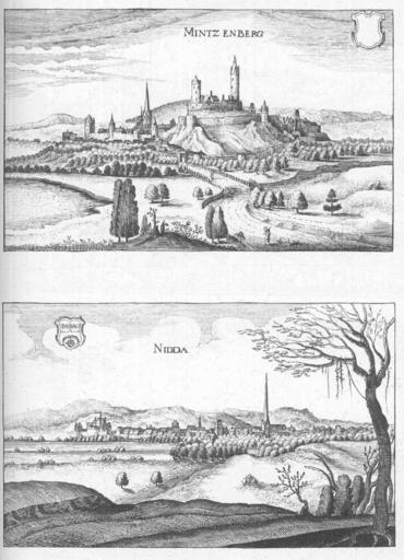 Keywords: De Merian Hassiae 161.jpg 160 162 Engravings of towns in Germany Engravings of castles in Hesse Burg Münzenberg History of Nidda