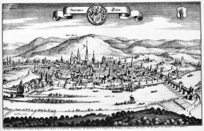 | Keywords: De Merian Mainz Trier Köln 045.jpg Trier Stich von 1646 Oben in der Mitte das Wappen des Trierer Kurfürsten Philipp Christoph von Sötern “ Abgebildete Einzelheiten sowie einzeln gespeicherte Bildausschnitte siehe unten <br> Matthäus Merians Stich von 1646 ähnelt stark dem Holzschnitt von Trier von 1548 in Sebastian Münsters Cosmographiae Universalis Titel Situs figura antiquissimae praecipuae Medioniatricum ciuitatis Treuirensis die als die erste authentische Stadtansicht von Trier gilt Zwar ist Merians Ansicht detaillierter als der Holzschnitt bildet aber bauliche Veränderungen die zwischen 1548 und 1646 vorgenommen wurden z B an der Konstantinsbasilika nicht ab Vergleich Kategorie Münster-Holzschnitt Trier und den vollständigen http //historic-cities huji ac il/germany/trier/maps/munster_lat_1550_trier html Holzschnitt in der lateinischen Ausgabe der Cosmographiae Universalis von 1550 auf Historic Cities Trier Germany Engraving from 1646 At the top the coats of arms of the Prince-Elector Philipp Christoph von Sötern For depicted details and cropped versions of this image see below <br> The engraving closely resembles a woodcut from 1548 While providing more details than the woodcut the engraving does not show changes of the view between 1548 and 1646 See Category Münster-Holzschnitt Trier and http //historic-cities huji ac il/germany/trier/maps/munster_lat_1550_trier html the woodcut in a Latin edition of the Cosmographiae Universalis of 1550 on the website Historic Cities 044 046 links lead to the German Wikipedia unless otherwise noted A St Paulin B Abtei St Maximin C St Simeon Simeonstift D deutsch Porta Nigra - English Porta Nigra E Martinskloster monastery of St Martin F Deutschordenskommende G Trierer Dom H Liebfrauenkirche I St Gangolf K Konstantinbasilika L Porta Alba probably refers to the city gate Alttor in the Kaiserthermen M Karthäuserkloster St Alban N Barbarathermen O St Barbara P Benediktinerabtei St Matthias other versions details of the original image are found as<br> Image St Paulin Stich von Merian jpg St Paulin at the far left side of the engraving Image St Paulin und St Maximin Stich von Merian mit Stadtmauer jpg St Paulin and St Maximin with a part of the defensive walls of Trier Image St Paulin und zentral St Maximin Stich von Merian mit Stadtmauer jpg St Paulin and St Maximin with a part of the defensive walls of Trier focussing more on St Maximin Image Roman Bridge Trier 1646 jpg Image Martinskloster De Merian Mainz Trier Köln 1646 jpg Monastery of St Martin image Wappen Philipp Christoph von Sötern De Merian jpg coat of arms on top of the engraving image Oerentor Trier 1646 1548 jpg city gate Oerentor Merian-Stich Trier Bridges in Trier Derivatives of the Coat of arms of Sötern family Derivatives of the Coat of arms of Trier diocese |