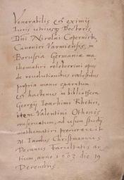 | Keywords: De Revolutionibus manuscript br.jpg Artwork en De revolutionibus p b recto pl De revolutionibus s b recto ink paper cm 28 19 213 leaves Kraków Institution Jagiellonian Library en Note by Jakob Christmann in Nicolaus Copernicus' manuscript of De revolutionibus orbium coelestium Venerabilis et eximii iuris utriusque doctoris Domini Nicolai Copernick Canonici Varmiensis in Borussia Germaniae mathematici celeberimi opus de revolutionibus coelestibus propria manu exparatum et haectenus in biblioteca Georgii Ioachimii Rhetici item Valentini Othonis conservatum ad usum studii mathematici procurauit M Iacobus Christmannus Decanus Facultatis artium anno 1603 die 19 Decembris Object history ProvenanceEvent 1543 transfer Tiedemann Giese bishop of Chełmno ProvenanceEvent 1554 transfer Georg Joachim Rheticus in Košice ProvenanceEvent 1574 transfer Valentinus Otho in Heidelberg ProvenanceEvent 1603 transfer Jakob Christmann in Heidelberg ProvenanceEvent 1614 transfer Jan Amos Komenský ProvenanceEvent 1667 transfer Otto von Nostitz in Jawor Śląski ProvenanceEvent 1675 transfer Nostitz family in Prague ProvenanceEvent 1945 transfer National Museum Library in Prague ProvenanceEvent 1956 transfer Jagiellonian University in Cracow gift of the the government of Czechoslovakia http //www bj uj edu pl/bjmanus/revol/images/br jpg www bj uj edu pl 10 000 1520-1541 Nicolas Copernicus Copyright expired PD-Art Other versions PD-old-100 De revolutionibus manuscript |
