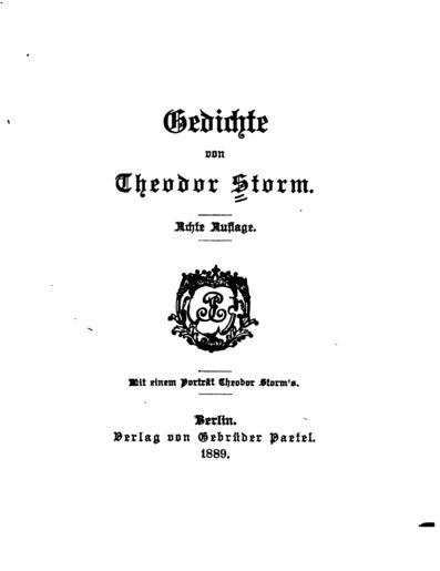 | Keywords: De Storm Gedichte 1889 A01.gif I01 A02 Gedichte von Theodor Storm Achte Auflage Berlin Verlag von Gebrüder Paetel own scan from original book 1889 Theodor Storm 1817-1888 Author died more than 70 years ago - public domain PD-old De Wikisource book leaflet Poems by Theodor Storm |