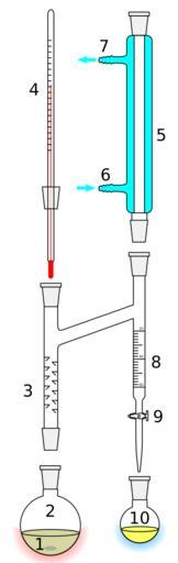Keywords: Dean-Stark apparatus.svg Dean-Stark apparatus 1 Stirrer bar/anti-bumping granules 2 Still pot 3 Fractionating column 4 Thermometer/Boiling point temperature 5 Condenser 6 Cooling water in 7 Cooling water out 8 Burrette 9 Tap 10 Collection vessel 1 Rührstab/Siedesteinchen 2 Rundkolben mit Reaktionsgemisch 3 Rektifikationskolonne 4 Thermometer 5 Kühler 6 Kühlwasser-Zulauf 7 Kühlwasser-Ablauf 8 Bürette 9 Ablasshahn 10 Sammelgefäß http //en wikipedia org/wiki/Dean-Stark_apparatus 2006-10-27 Original PNG by User Quantockgoblin SVG adaptation by User Slashme Own work all rights released public domain left 65px svg version based on png version by Quantockgoblin Laboratory distillation apparatus Condensers chemistry laboratory equipment |