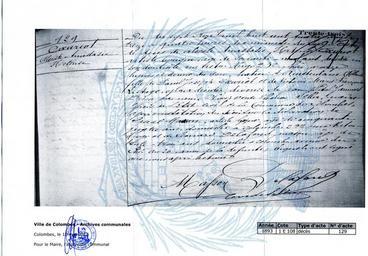 | Keywords: Death certificate of Alceste COEURIOT - 1893.jpg fr Acte de décès d'Alceste Coeuriot communiqué par les Archives Municipales de Colombes le 10 mai 2012 publié avec leur aimable autorisation <br/> Transcription<br/>Du dix sept Avril mil huit cent quatre vingt treize à quatre heures dix minutes du soir acte de décès de Alceste Anastasie Hortense CÅ“uriot artiste lyrique âgé de soixante-neuf ans décédé en son domicile rue Victor Hugo 232 hier à onze heures et demie du soir native d ™Amsterdam Hollande fille de Paul Joseph CÅ“uriot et Victoire Marie Françoise Lestage époux décédés divorcée de Jean Vital Jammes Dressé par nous Co Oreste Eléonor Sellier maire officier de l ™Ã©tat-civil de la commune de Colombes après constatation du décès sur la déclaration de Pascal Masson artiste lyrique âgé de cinquante quatre ans domicilié à Colombes 232 rue Victor Hugo et de Léonard Delafond maçon âgé de trente-trois ans domicilié à Colombes avenue du au 26 amis de la défunte lesquels ont signé avec nous après lecture<br/> Masson Delafond<br/> Co Sellier<br/> En marge 129 CÅ“uriot Alceste Anastasie Hoortense 2012-05-10 Scan by Jean GUERIN 2012 Muinicipal archives of Colombes Hauts-de-Seine France - Cote 1 E 108 - Death certificate 1893 PD-Art Uploaded with UploadWizard Jean-Vital Jammes - French « État-civil » documents |