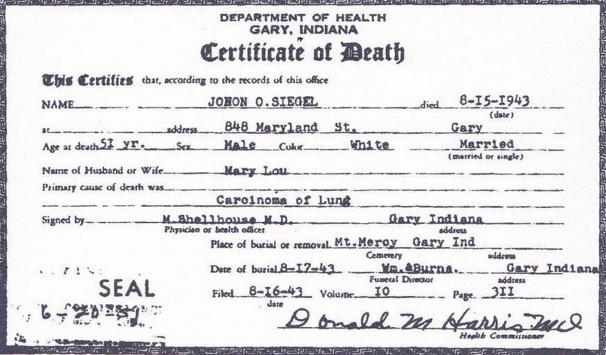 Keywords: Death certificate of John Otto Siegel, front view.jpg Uploaded with en wp UW marker 2013 06 14 Death certificate of John Otto Siegel front view http //home ancestry com/ 1943-08-16 Department of Health Gary Indiana Medal of Honor families John Siegel Medal of Honor documentation 1943 documents PD-USGov |