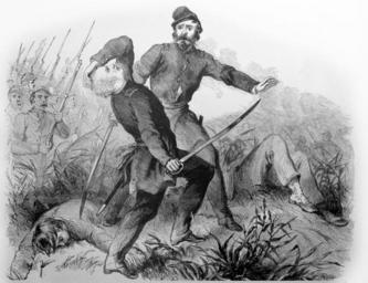| Keywords: blackandwhite monochrome surreal black and white Colonel E. D. Baker, while commanding the First California Volunteers, which formed part of General Stone's brigade at the battle of Ball's Bluff, and who had just before he entered battle been notified of his appointment as brigadier general, was killed while at the head of his command, pierced by bullets in the head, body, arm and side. He died as a soldier would wish to die, amid the shock of battle, by voice and example animating his men to brave deeds. (from Frank Leslie's Illustrated History of the Civil War..., edited by Louis Shepheard Moat, Published by Mrs. Frank Leslie, New York, 1895) Colonel E. D. Baker, while commanding the First California Volunteers, which formed part of General Stone's brigade at the battle of Ball's Bluff, and who had just before he entered battle been notified of his appointment as brigadier general, was killed while at the head of his command, pierced by bullets in the head, body, arm and side. He died as a soldier would wish to die, amid the shock of battle, by voice and example animating his men to brave deeds. (from Frank Leslie's Illustrated History of the Civil War..., edited by Louis Shepheard Moat, Published by Mrs. Frank Leslie, New York, 1895) |